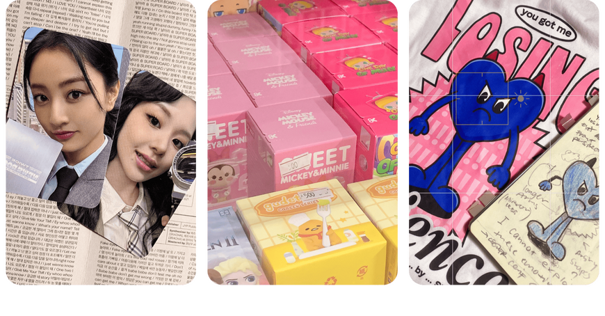 others. plushies, keyrings, art prints, deco toploaders, poca holders, sanrio merch